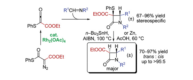 Ketene-imine cycloaddition reactions (the Staudinger reaction) of ethoxycarbonyl(phenylthio)ketene with various imines and subsequent desulfurization reactions were employed to synthesize 3-ethoxycarbonyl β-lactam derivatives. The results indicate that the current approach provides a convenient, mild, and versatile method for synthesizing a variety of 3-alkoxycarbonyl trans-β-lactam derivatives with good to excellent yields and diastereoselectivities.