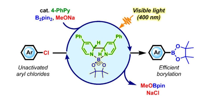 The preparation of arylboronates from unactivated aryl chlorides in a transition-metal-free manner is rather challenging. There are only few examples to achieve this goal by using ultraviolet irradiation. Based on the mechanistic understanding of the diboron/ methoxide/pyridine reaction system, we achieved photoactivation of the in situ generated super electron donor and developed a visible-light-induced organocatalytic method for efficient borylation of unactivated aryl chlorides.
