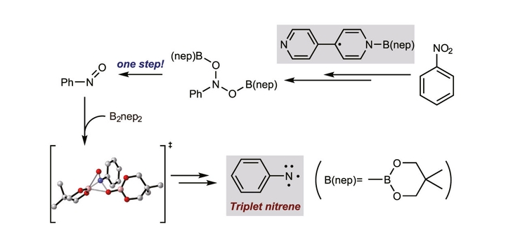 Diboron(4) compounds serve as useful reagents for borylation, diboration, and reduction in organic synthesis. A variety of pyridine derivatives have been found capable of activating diboron(4) compounds, and different reaction mechanisms have been identified. 4,4'-Bipyridine was found to activate diboron(4) to form N,N'-diboryl-4,4'-bipyridinylidene in 2015, and very recently, it has been found that this transformation is crucial in the 4,4'-bipyridine-catalyzed reduction of nitroarenes by bis(neopentylglycolato)diboron (B2nep2), which features the formation of arylnitrene intermediates. However, the mechanism of N,N'-diboryl-4,4'-bipyridinylidene formation, as well as its role in the transformation of nitroarene to arylnitrene, remains unknown. In this work, we investigated the possible pathways of this intriguing transformation and discovered several important intermediates through density functional theory (DFT) calculations. An N-boryl-4,4'-bipyridyl radical was found to be a crucial intermediate in both the formation of N,N'-diboryl-4,4'-bipyridinylidene and the reduction of nitroarene. A type of single-step reaction with three stages, including a dissociation and two migration steps, was identified in the generation of nitrosobenzene and its reduction. Arylnitrene formation was found to occur on a triplet potential energy surface, and an intersystem crossing was found to be important for achieving a reasonable activation energy barrier for nitrene formation. We anticipate our work to provide deeper insights into the nature of this reaction that could facilitate further rational design of pyridine- and bipyridine-based catalysts.