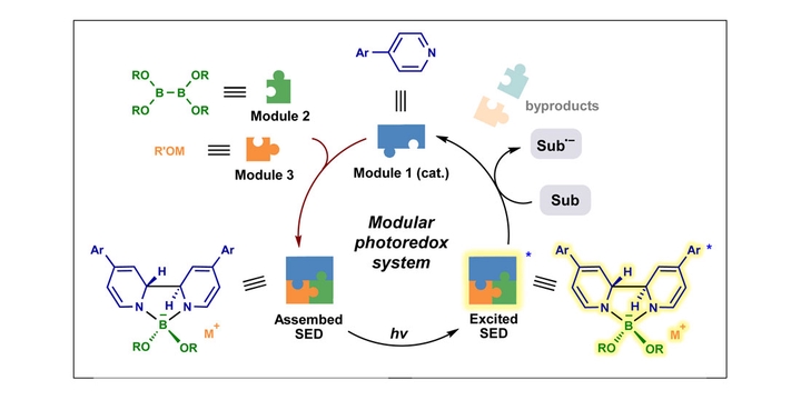 Photoinduced electron transfer is an efficient approach to single-electron reduction of organic molecules for their activation. A variety of molecular photoredox systems have been developed for this purpose, whereas only a few of them exhibit potent reduction abilities required for reducing inert substrates, and more new systems with extreme reduction potentials are highly desirable. Notably, developing a new photoredox system usually requires iterative work on molecular design and synthesis. In this work, we present a conceptually distinct modular photoredox system, which features the in situ formation of a photoredox-active species from three simple modules (a pyridine derivative as catalyst, and a diboron[4] compound and an alcoholate as sacrificial components). This allowed for flexible tuning of its property to approach extreme reduction potentials, enabling a wide range of challenging single-electron reduction reactions. This work extends the utility of pyridine catalysis and serves as the proof of concept of the molecular photoredox system.