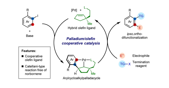 Engineering of molecular catalysts in homogeneous catalysis enables new catalytic modes, leading to efficient synthetic transformations. In this regard, design of ligands for transition-metal catalysis has played a major role. In transition metal catalyzed reactions, olefins can serve as steering ligands by tuning the electronic and steric nature of the metal centre. Here we report unstrained olefin ligands bearing a P or S coordination site for use in the Pd-catalyzed Catellani reaction. This olefin shows covalent catalytic function and enables efficient ipso,ortho-difunctionalization of iodoarenes. Mechanistic analysis reveals reversible covalent bonding between the substrate and the cycloolefin unit of the ligand, forming key organopalladium intermediates to enable new reactivity. Our results demonstrate a design concept that employs hybrid cycloolefin ligands as a covalent catalytic module, opening possibilities for further cooperative catalysis with other transition metal–olefin hybrids.